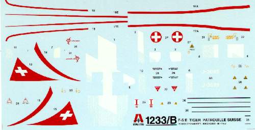 127 Teile, 7 Transparentteile, Decals für ein Flugzeug der 144 Squadron Singapore Air Force, sowie die J-3019 der Fl St 11 und einen Sonderbogen für die J-3089 im rot-weissen Patrouille Suisse Anstrich.